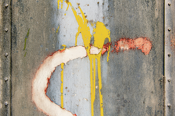 A vibrant splash of yellow paint drips down a weathered metal surface, interacting with red and white marks to create a dynamic visual contrast... more
