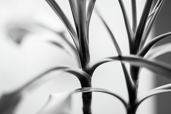 A close-up of plant leaves is captured in monochrome, highlighting the delicate play of light and shadows on their slender forms. The focus is on the sleek stems that curve and intertwine gracefully, creating a sense of elegance and tranquility.
